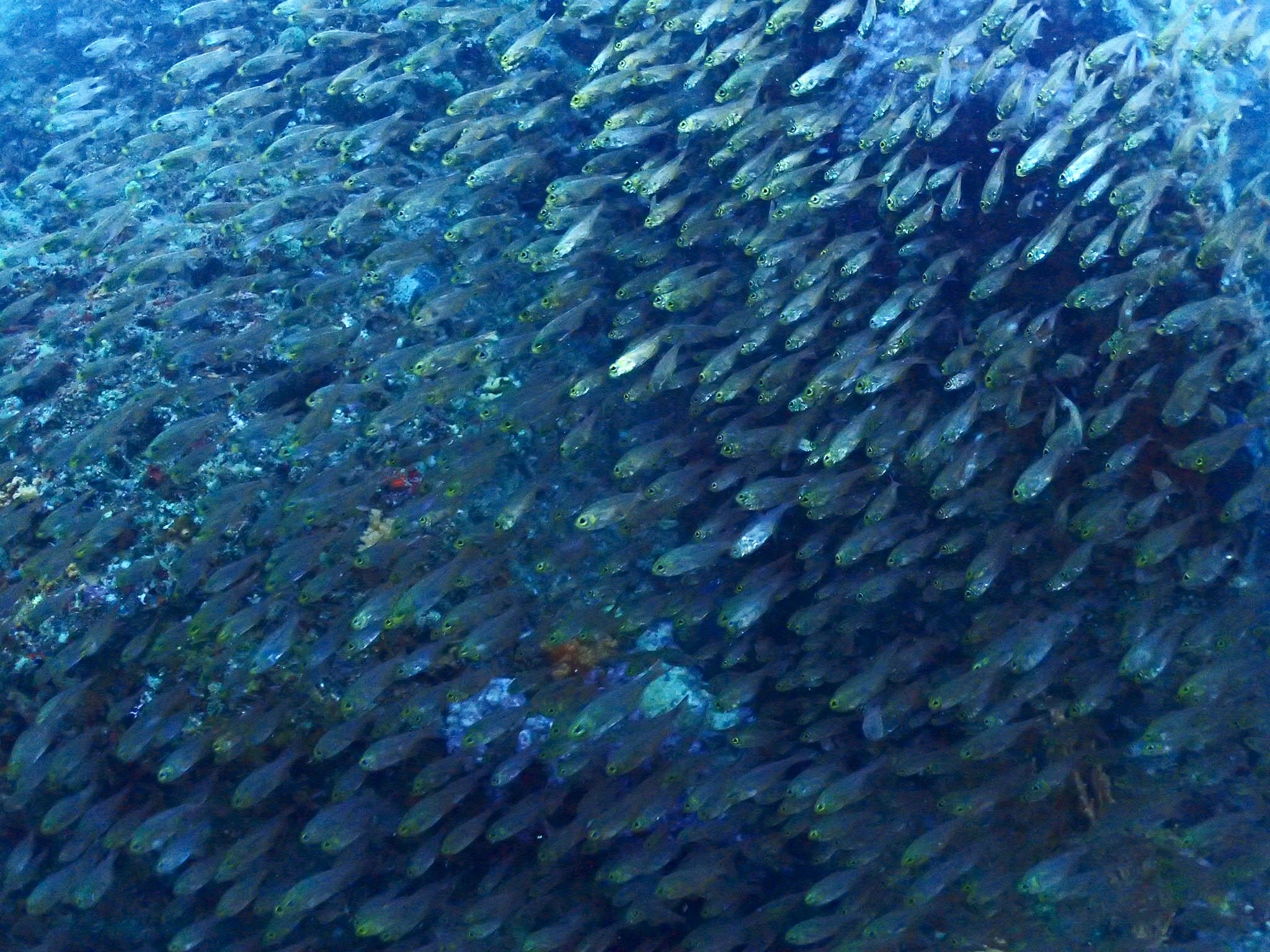 穴の中には光が見えなくなる程のキンメモドキが群れていたり、洞窟の外には色鮮やかなソフトコーラルが咲いて居たりと地形以外にも楽しむ事が出来ます。